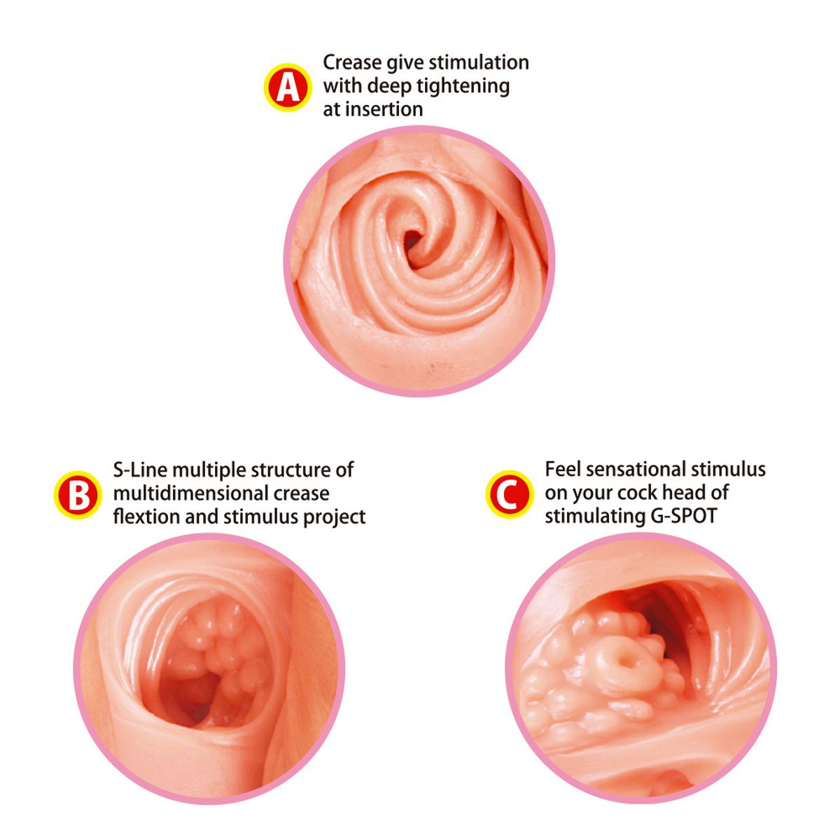 Крупный мастурбатор с маленькими вагинами на внешней стороне, с винтовым S-образным отверстием и точкой G.