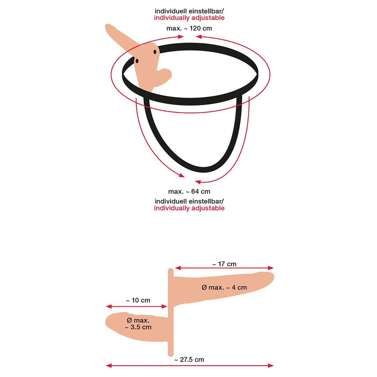 Двойной страпон телесного цвета с черным съемным поясом из искусственной кожи и двумя латексными вибраторами в форме пениса.