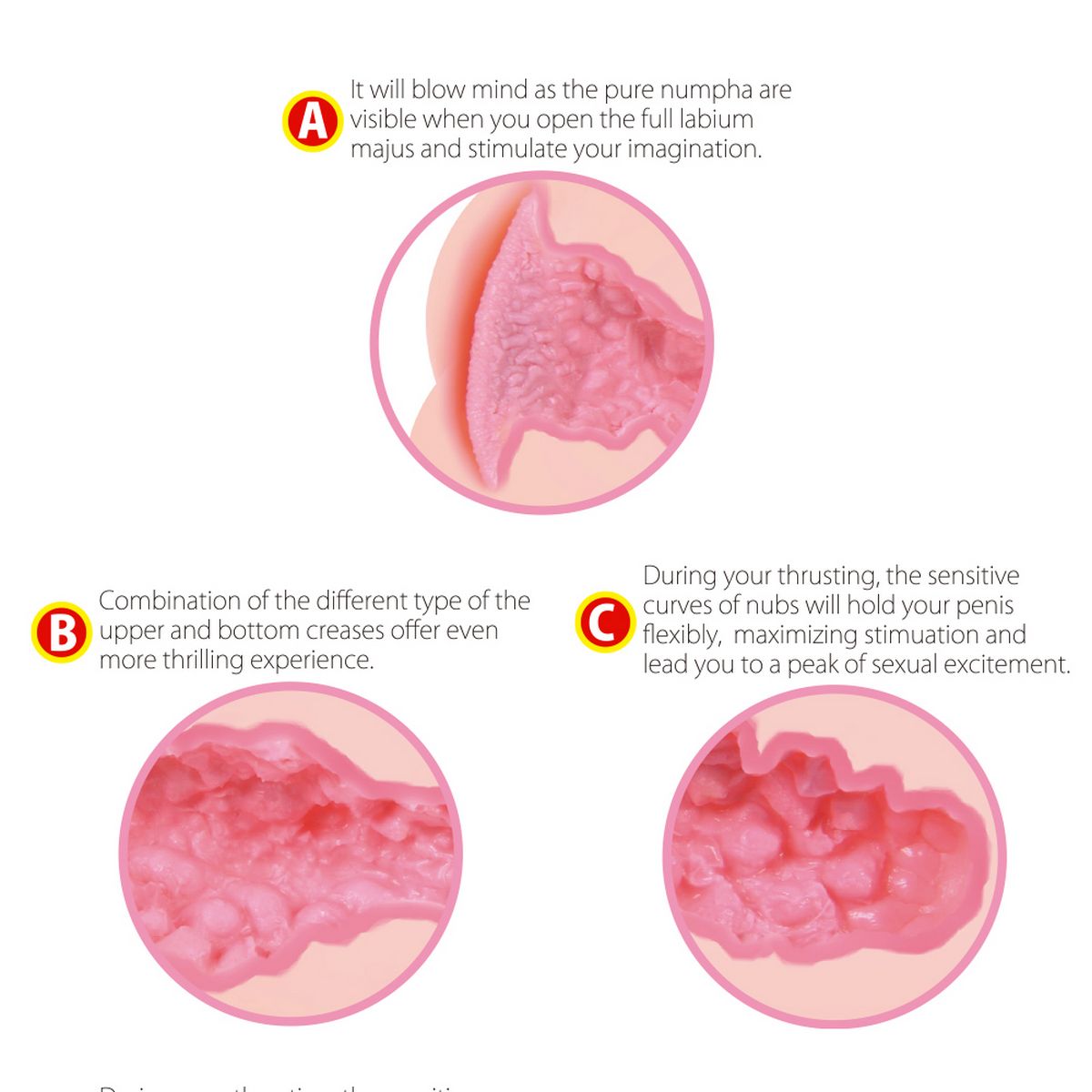 Приятный на ощупь, легко растягивается до нужного размера. Имеет рельефную внутреннюю поверхность. Сделана из материала абсолютно идентичного натуральному телу живого человека. Внутренность Мастурбатора с анатомически-верными изгибами и рельефом повторяющим все особенности внутреннего строения женского влагалища.