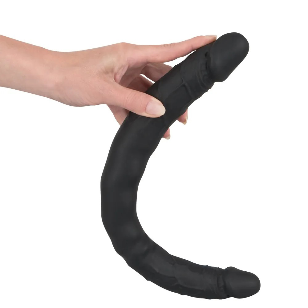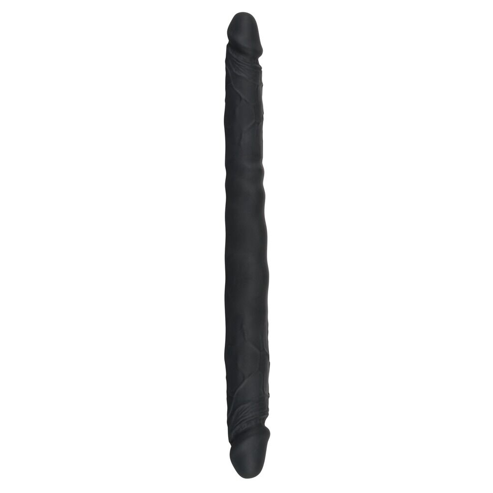 Двухсторонний фаллоимитатор черного цвета, с ярко выраженными венками и головками для чувственной стимуляции эрогенных зон.