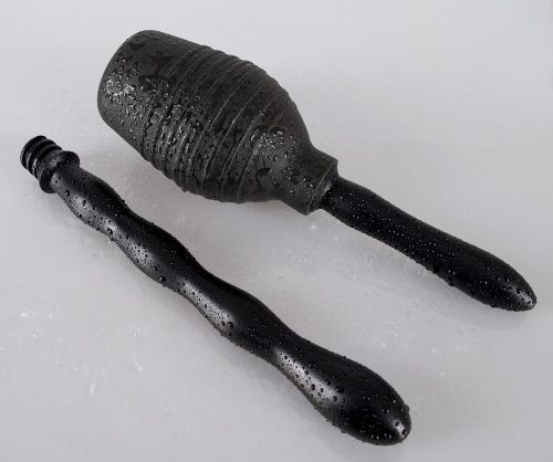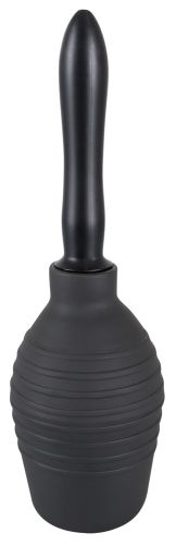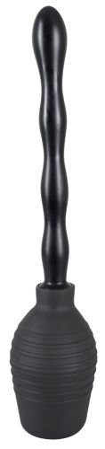 Черный интимный душ (высота 13 см, объем 300 мл) с двумя сменными винтовыми насадками с форсунками. Легко очистить. Длинная волнистая насадка: общая длина 23 см, диаметр 1,7-3 см. Короткое гладкое крепление: общая длина 11,5 см, диаметр 1,9-2,3 см. Материал: ПВХ.