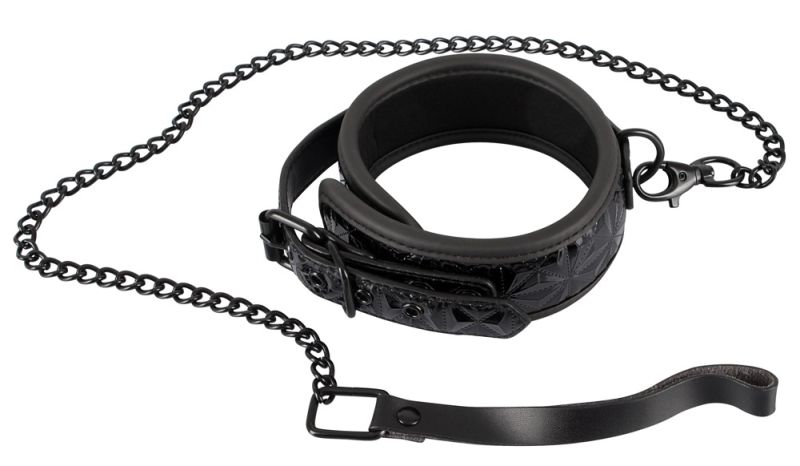 Черный ошейник с рельефной поверхностью с красивым ромбовидным узором. Закругленные края. В комплекте черный матовый поводок с карабином и петлей для запястья (полная длина 88 см). Воротник шириной 5,5 см, обхват регулируется от 40 до 48 см. Материал: полиуретан, металл, спилок, синтетический каучук.