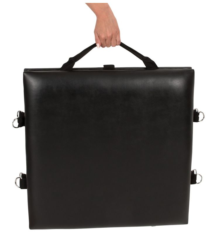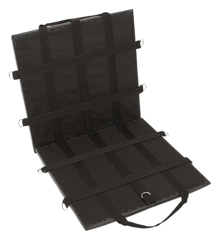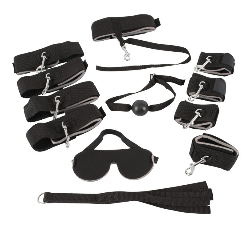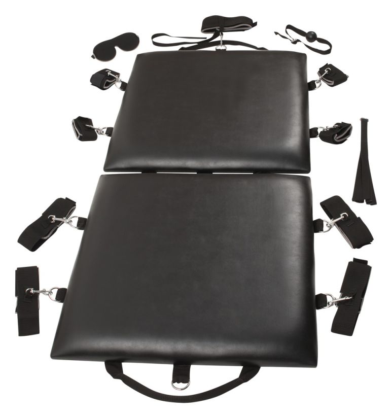Доска для связывания складывается и имеет удобный для переноски ремень. В комплект входят различные аксессуары: мягкие манжеты для запястий и лодыжек (по 4 штуки) и чокер - все фиксаторы можно закрепить в любом месте на доске с помощью защелок. 1 кляп, 1 флоггер и 1 повязка на глаза также включены.