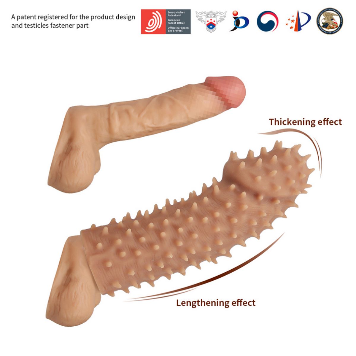 Насадка очень эластичная, имеет узор выпуклые венки и шипы по всей поверхности, для стимуляции эрогенных зон партнера, увеличивает толщину головки и ствола пениса.