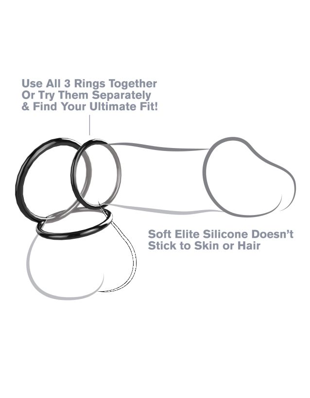 Набор из трех эрекционных колец разного диаметра. Выполнены из качественного эластичного силикона. Кольца легко одеваются на пенис, препятствуют оттоку крови, делая эрекцию более сильной и длительной.