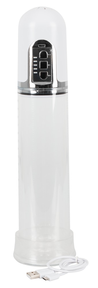 Эта прозрачная помпа для пениса имеет колбу, насадку, которые создают вакуум, и серебристую панель управления с 3 кнопками. Он также имеет измерительную шкалу в сантиметрах и дюймах. Перезаряжается с помощью прилагаемого USB-кабеля.