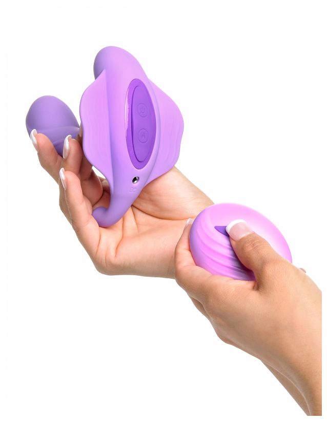 Тем временем основание стимулятора, похожее формой на бабочку плотно ложится на вульву и прекрасно стимулирует клитор, виброэлемент в основании синхронизирован с моторчиком в основном отростке.