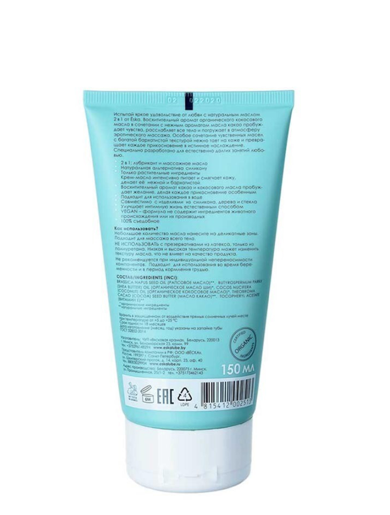 Испытай яркое удовольствие от любви с натуральным маслом 2 в 1 от Ёska. Восхитительный аромат органического кокосового масла в сочетании с нежным ароматом масла какао пробуждает чувства, расслабляет все тело и погружает в атмосферу эротического массажа.Особое сочетание чувственных масел с богатой бархатистой текстурой нежно тает на коже и превращает каждое прикосновение в истинное наслаждение. Специально разработано для естественно долгих занятий любовью.