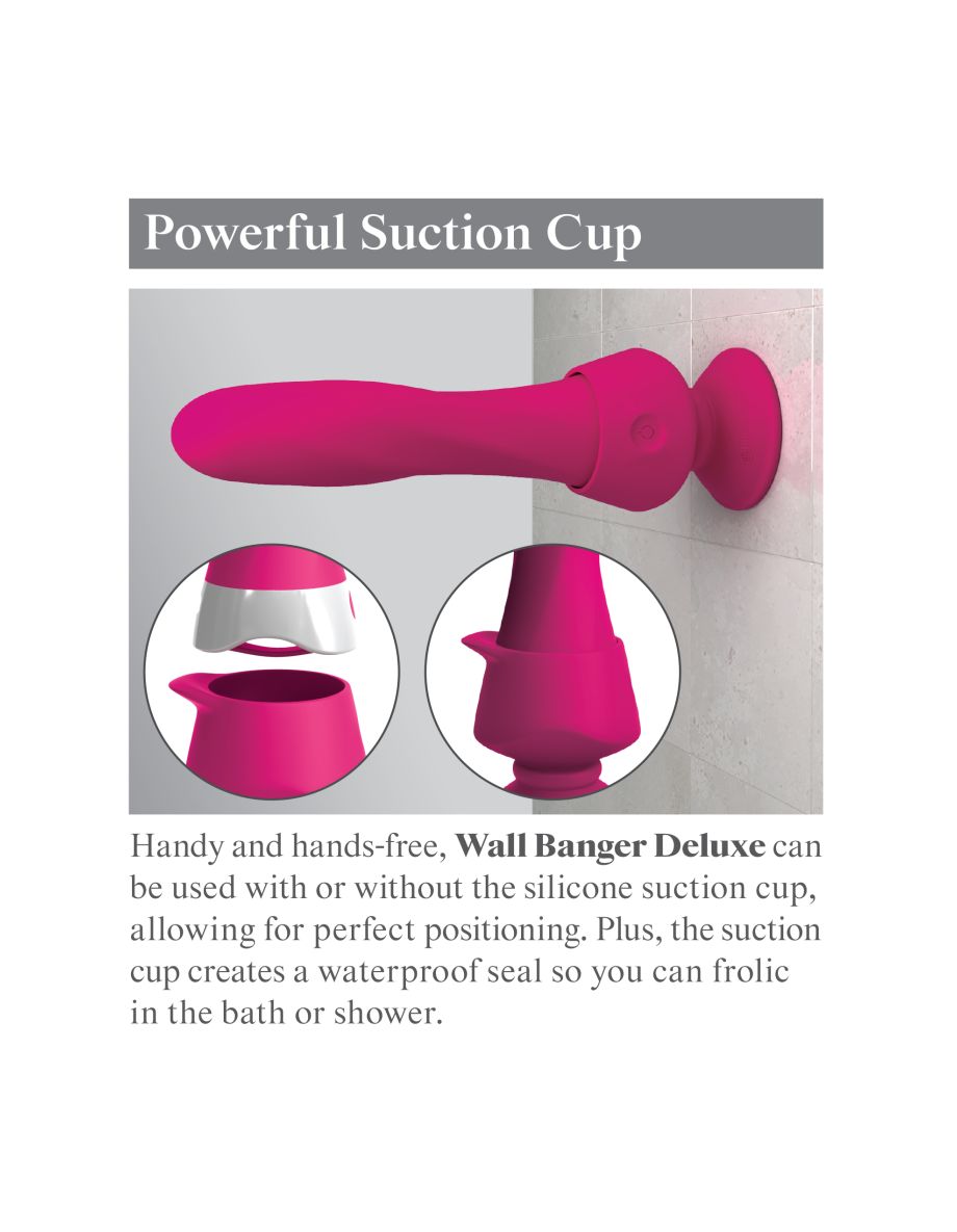 Wall Banger Deluxe можно использовать со съемной мощной силиконовой присоской или без нее, что обеспечивает комфортное использование без помощи рук. Кроме того, присоска создает водонепроницаемое уплотнение, поэтому вы можете "резвиться" в душе.