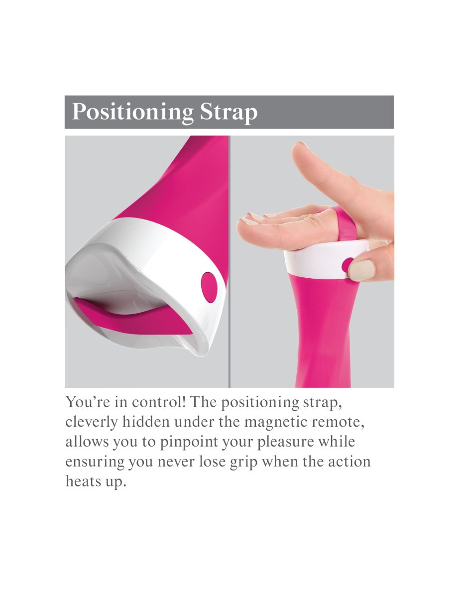 Позиционирующий ремешок, скрытый под прилагаемым съемным магнитным пультом дистанционного управления, позволяет точно определить свое удовольствие, гарантируя при этом, что вы никогда не потеряете контроль в процессе использования.