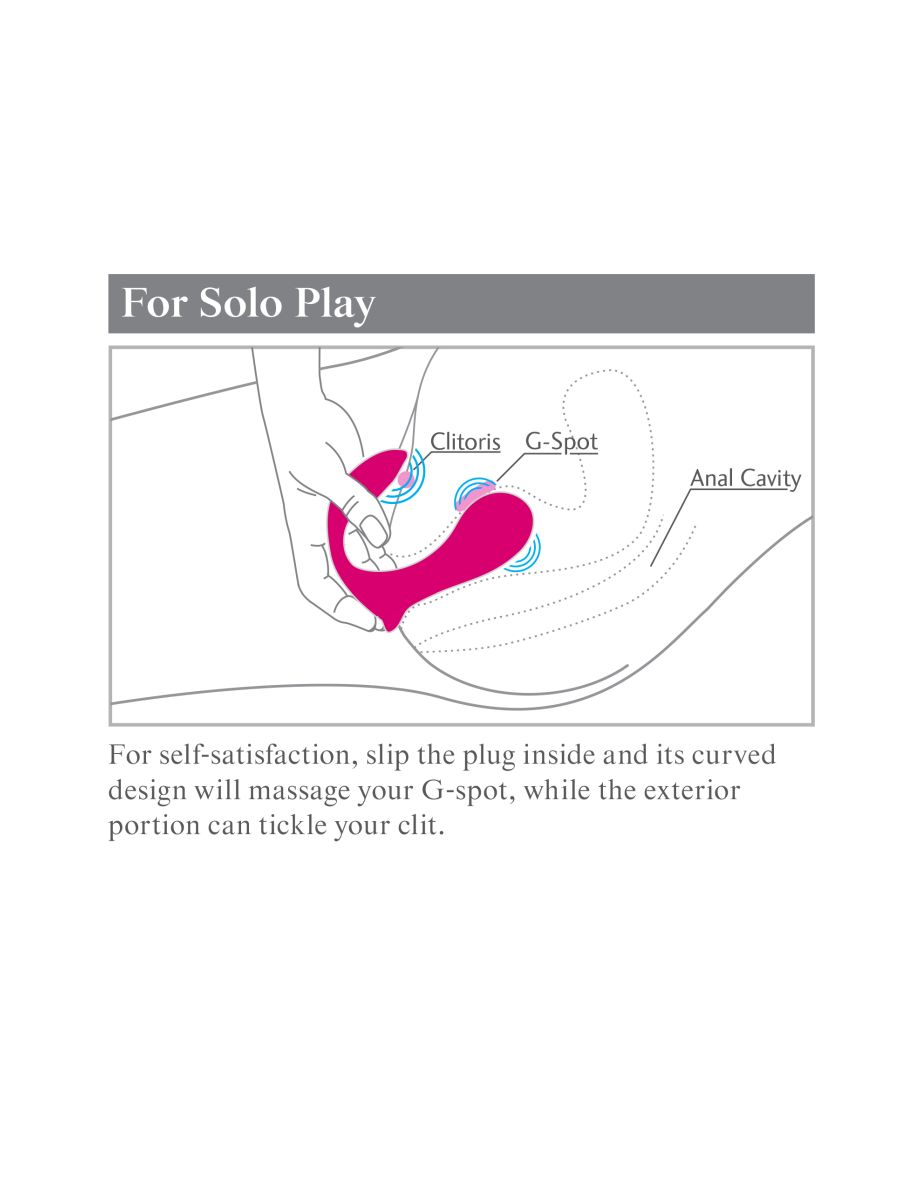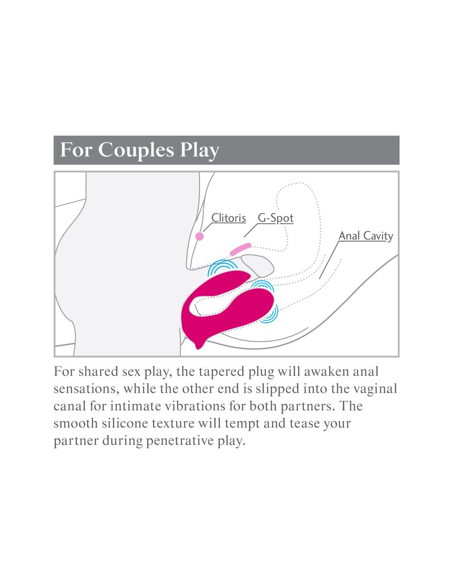 Для совместной сексуальной игры небольшая обтекаемая пробка пробуждает анальные ощущения, а "вибро - крылышко" скользит в вагинальный канал для интимных вибраций для обоих партнеров. Гладкая силиконовая текстура приятно дразнит вашего партнера во время пенетрации, а партнерша ощущает большее трение, что невероятно повышает вероятность множественных оргазмов.