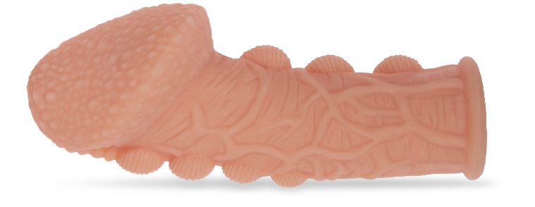 Насадка очень эластичная, имеет увеличенную текстурированную головку, венки по всей поверхности и ряд выпуклых бугорков,имтирующих пирсинг, шерховатость на головке для стимуляции эрогенных зон партнера, увеличивает толщину головки и ствола пениса.
