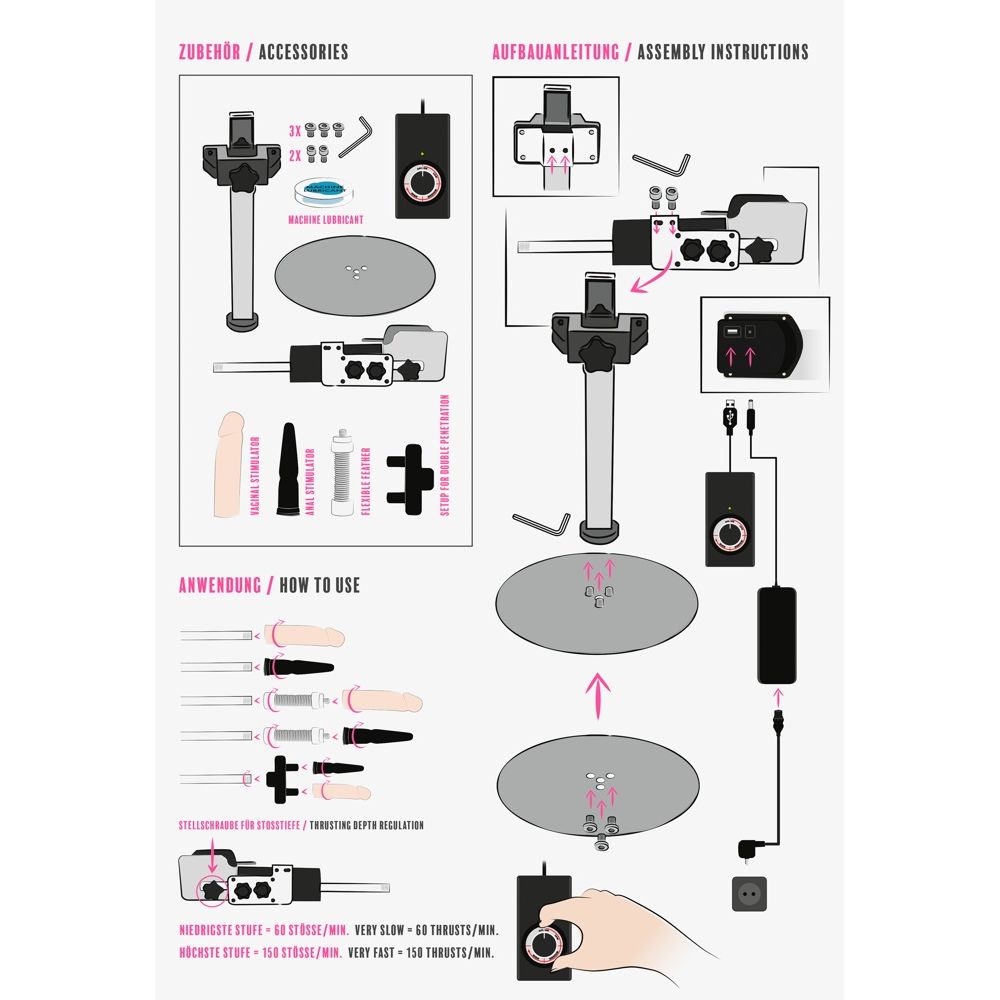 Секс-машина с регулируемой по высоте стойкой и двумя насадками. С пультом дистанционного управления для регулирования и поворота до почти 360°. Бесступенчатая регулировка ударов достигает 150 ударов в минуту, а глубина ударов может регулироваться до 8 см. Предназначен для работы в режиме "свободные руки" и выполнен в тонком современном дизайне для максимального использования. Кабель длиной 1,5 метра с штекером SchuKo типа F. В комплект поставки входит штекерное крепление для двойного проникновения.