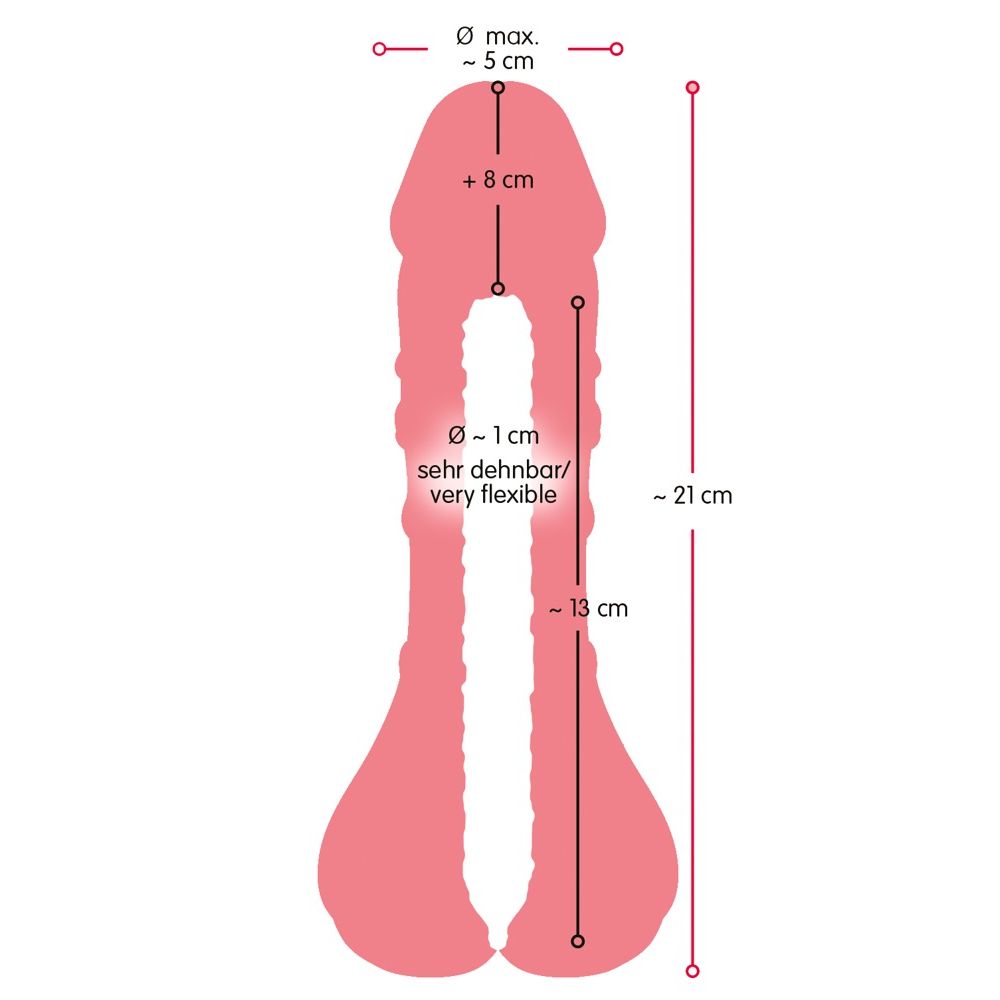 Общая длина 21 см, длина вставки 16 см, глубина вставки 13 см. Наружный Ø 4,2-5 см, внутренний Ø 1 см, эластичные. Материал TPE.