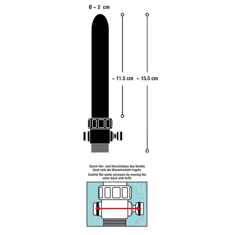 Анальный душ серебристого цвета с 5 отверстиями для струи и стандартной резьбой для душевого шланга с запорным клапаном, который обеспечивает возможность выключения и повторного включения воды по желанию без изменения температуры и давления воды. Кроме того, воздух не всасывается.