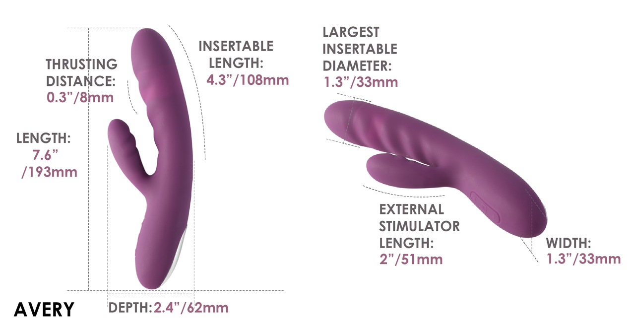 Avery — это идеальный вибратор для тех, кто ценит разнообразие ощущений и комфорт в каждом моменте. Наслаждайтесь вибрацией и проникающими фрикциями, которые гарантируют незабываемые оргазмы!