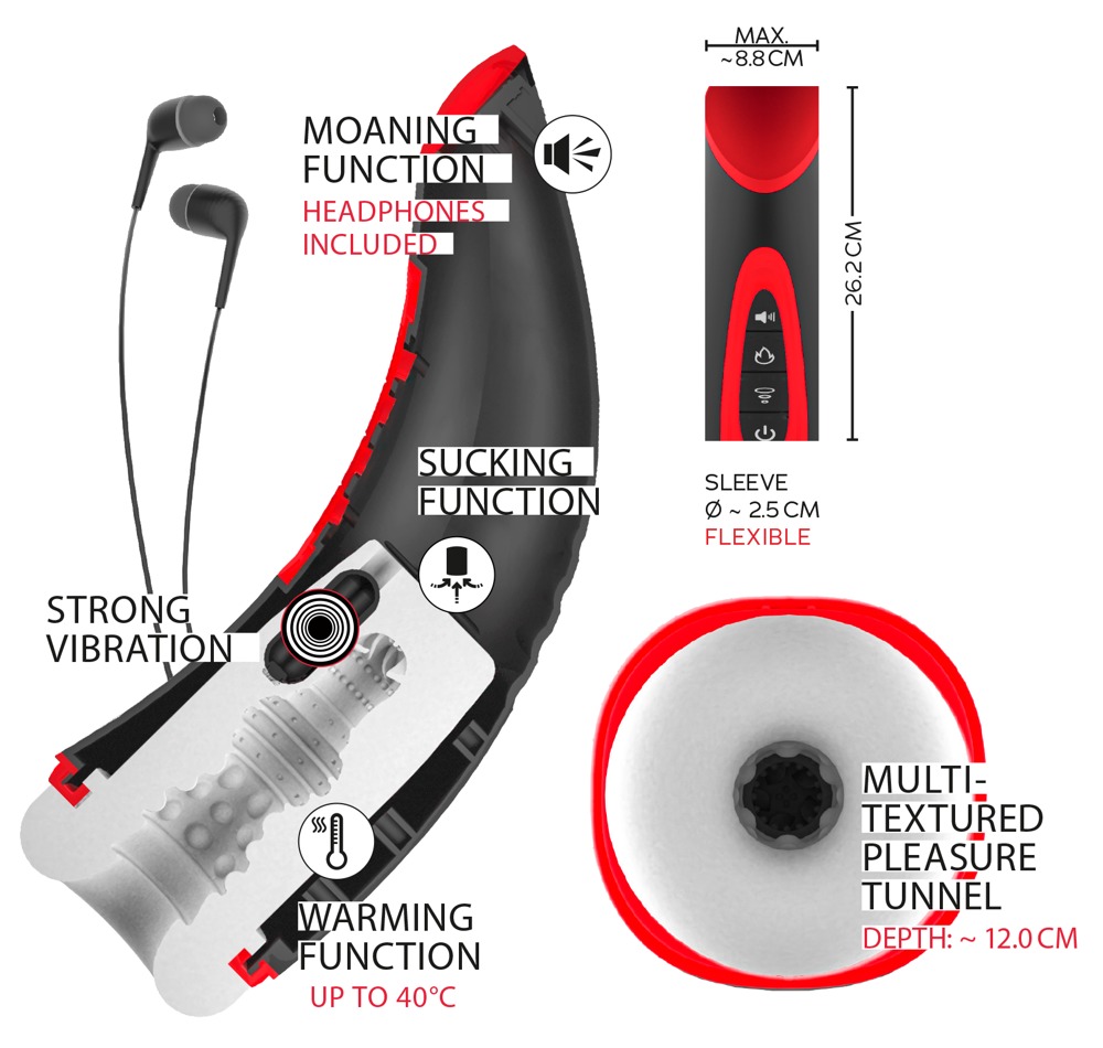 Мощный мастурбатор WYNE 03, который обеспечивает интенсивную, полностью автоматическую стимуляцию полового члена с 7 режимами вибрации и 3 режимами всасывания. Функция нагрева до 40°C и легкие и сексуальные стоны (3 сценария звука) через прилагаемые наушники еще больше возбудит человека, использующего мастурбатор. Всеми функциями можно легко и отдельно управлять с помощью кнопок на корпусе мастурбатора.