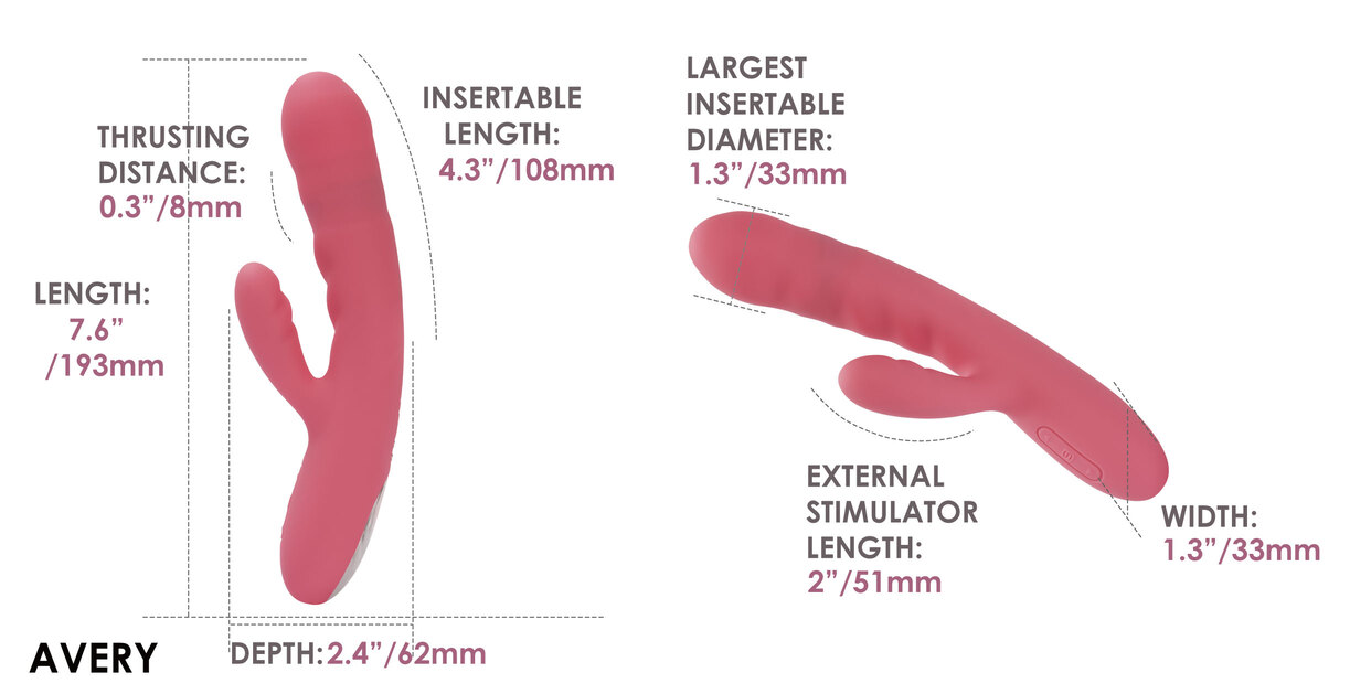 Avery — это идеальный вибратор для тех, кто ценит разнообразие ощущений и комфорт в каждом моменте. Наслаждайтесь вибрацией и проникающими фрикциями, которые гарантируют незабываемые оргазмы!