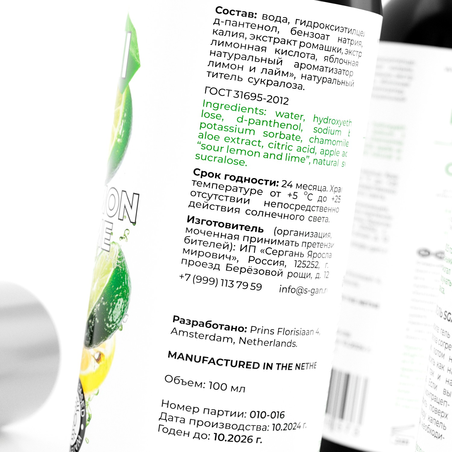 Состав: Вода, гидроксиэтилцеллюлоза, д-пантенол, бензоат натрия, сорбат калия, экстракт ромашки, экстракт алоэ, лимонная кислота, натуральный ароматизатор "Лимона и лайма", натуральный подсластитель (сукралоза).