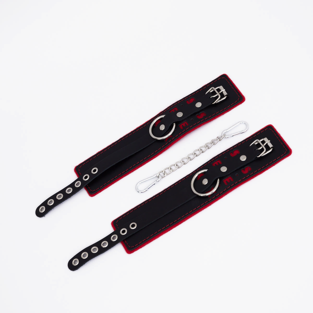 Изделие выполнено из 100% натуральной кожи , которая мягко облегает, обеспечивая непревзойденный комфорт даже при длительном использовании. В центре композиции — стальное хромированное кольцо из нержавеющей стали , которое добавляет конструкции прочности и элегантности. А мягкая подкладка красного цвета с контрастной строчкой делает эти оковы по-настоящему стильными и запоминающимися.