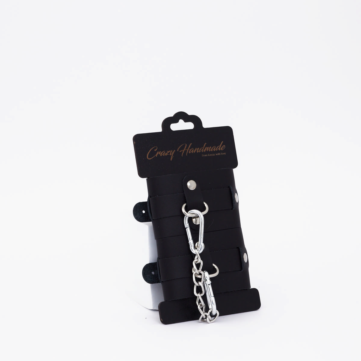 Изделие состоит из двух деталей: основа прямоугольной формы из натуральной кожи черного цвета и ремешок с прочной хромированной фурнитурой в виде овального кольца . Расположение ремешка через прорези основной части не только является стильным декоративным решением, но и служит для точной регулировки размера, обеспечивая идеальную посадку (от 15 до 22 см).