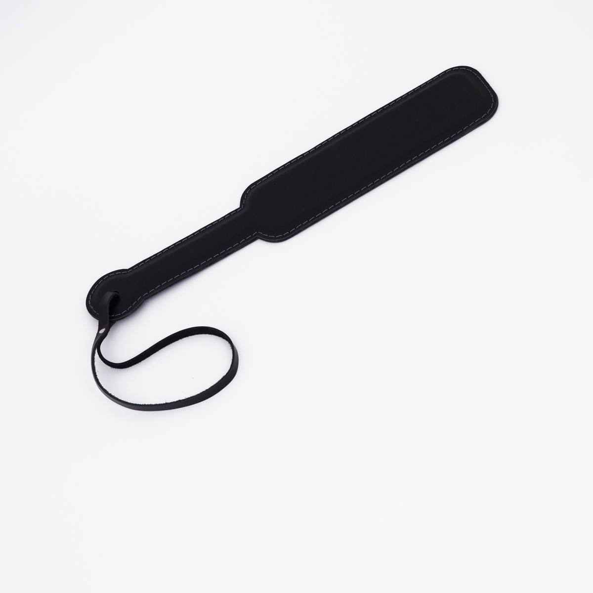 Изделие выполнено из натуральной кожи черного цвета , которая обтягивает прочную гибкую основу. Такая конструкция обеспечивает долговечность и надежность паддла, а также делает его использование максимально комфортным. Ударная часть украшена белой декоративной строчкой , которая добавляет изделию стильный контрастный акцент и подчеркивает его уникальный дизайн.