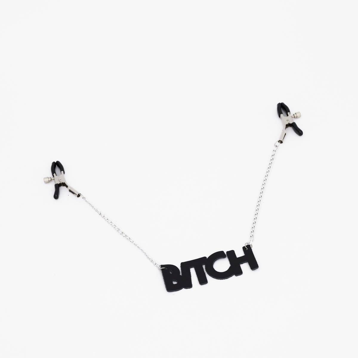 Зажимы оснащены мягкими резиновыми наконечниками , которые обеспечивают комфортное сжатие сосков, не травмируя кожу. Между собой зажимы соединены металлической цепочкой , на которой эффектно расположена надпись BITCH , добавляющая изделию игривости и интриги. Сила сжатия регулируется с помощью подвижного колечка на зубцах , что позволяет настроить интенсивность воздействия под свои предпочтения.