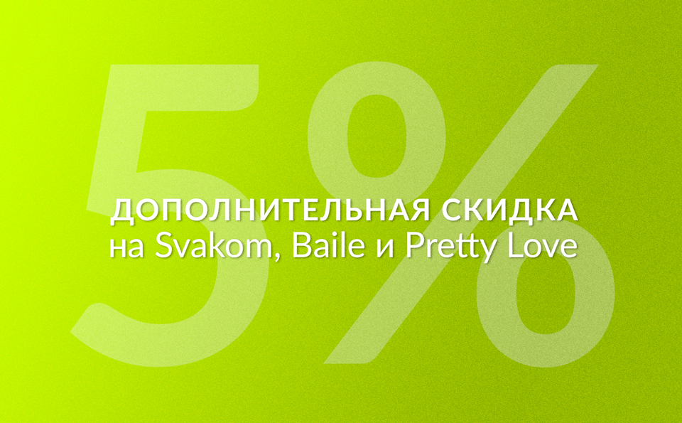 На весь ассортимент товаров Svakom (кроме Emma Neo), Baile и Pretty Love предоставляется дополнительная скидка в размере 5% на период с 15 по 30 июня 2021 г. включительно.