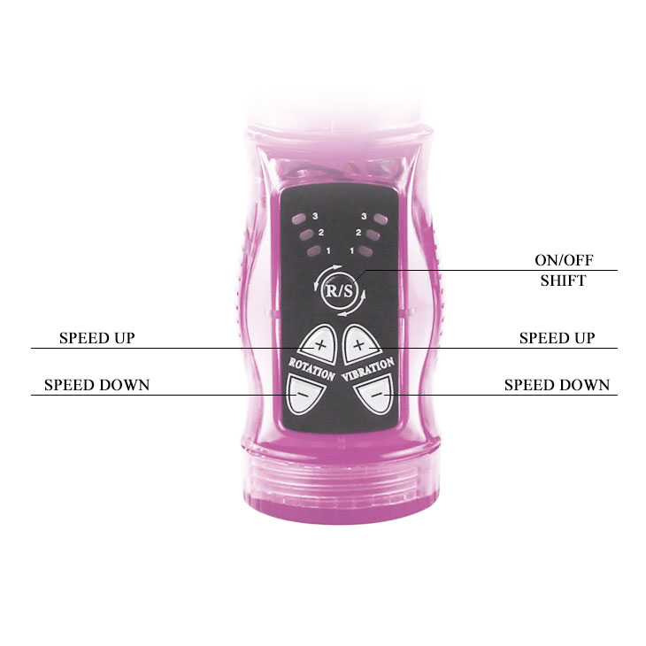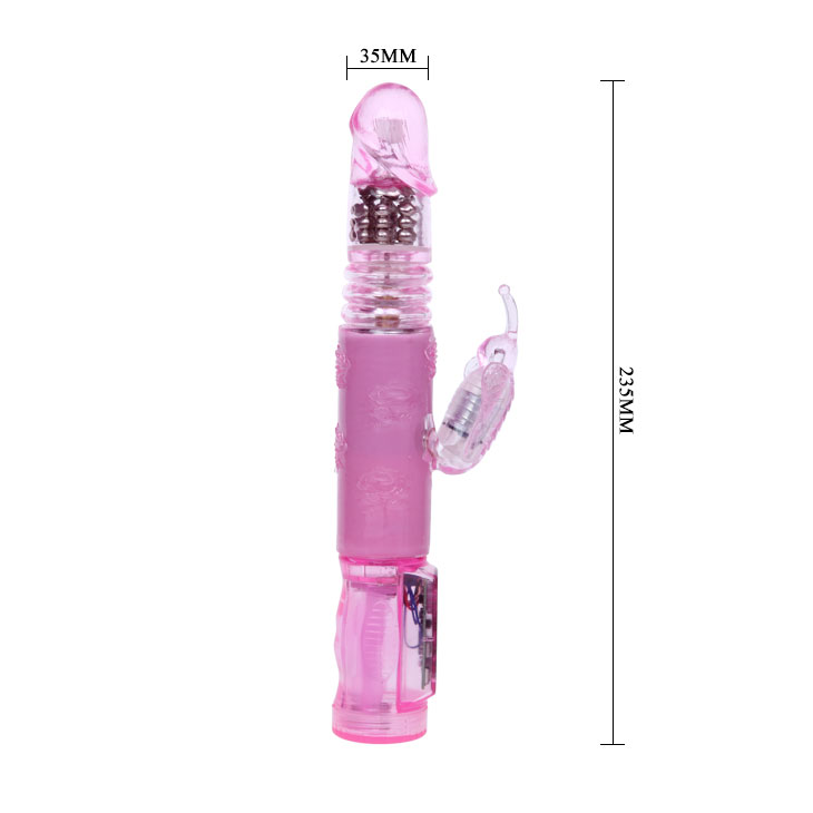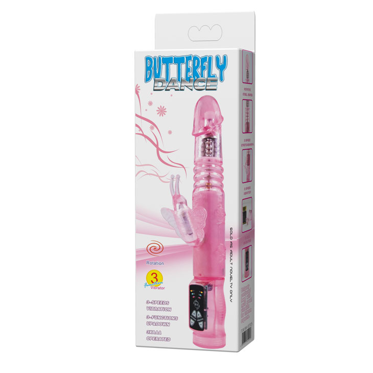 Вибромассажер с поступательными функциями, с клиторальным стимулятором в виде бабочки. Многофункциональный! Совершает вращательно - поступательные движения (вокруг своей оси и вверх-вниз) имеет автоматический реверс (совершает вращательные движения влево-вправо). Плавная регулировка вибрации и пульсации