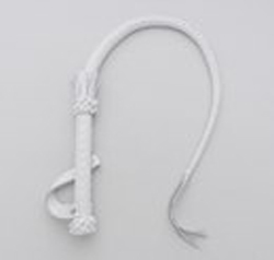 Однохвостая длиная плеть имеет стандартную жесткую ручку и плетеное тело из белой кожи. Тело плети заканчивается узлом и хлопушкой из той же кожи. Общая длина этой плети 900 мм. Материал: натуральная кожа. Применяется для точечного воздействия, протяжек, ударов накатом и других комбинаций ударов. Имеет сильное и жесткое воздействие. Используется после предварительного разогрева тела.