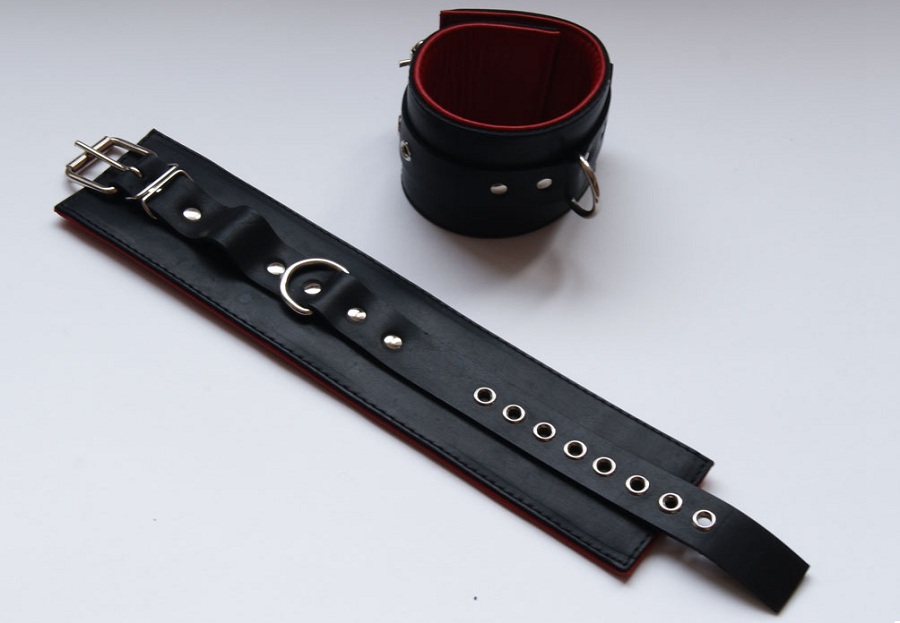 Наножники. Подшитые. Застежка - ремешок с металлической пряжкой. Ширина 7см. Имеется 1 сварное D - кольцо. Внутри вставлена мягкая проставка, обтянутая кожей. Без соединительной фиксации. Цвет: черно / красный. Максимальный диаметр 8см. Материал: натуральная кожа.