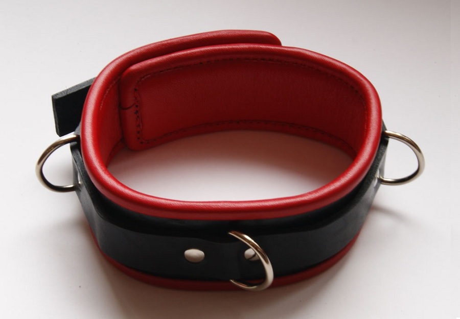 Ошейник средний комфортный (с мягкой подкладкой и подшитыми краями) черно-красный. Ширина 50 мм. Застежка — ремешок с пряжкой, с 3–мя вертикальными D–кольцами (25 мм). При помощи этих колец и дополнительных карабинов (лент, веревок) вероятна масса комбинаций для дальнейшего бандажа (руки, ноги, соски, гениталии). Все ограничивается лишь вашей фантазией! Материал: натуральная кожа. Ошейник в BDSM может иметь различные назначения. Он может использоваться в качестве антуража для создания образа. Может использоваться в практическом назначении как один из связующих элементов бандажа. А самое главное - он имеет глубокое психологическое значение, так как ошейник это основная эмблема подчинения и наказания.