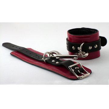 Наручники неподшитые. Имееют застежку - ремешок из красной кожи с металлической пряжкой, 3 сварных D - кольца. Ширина 6,5см. Без соединительной фиксации. Цвет: черно / красный. Диаметр 5-8см. Материал: натуральная кожа.