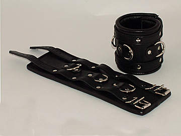 Наручники подшитые широкие. Ширина 8см. Застежка - 2 ремешка с металлическими пряжками. Имеют 3 сварных D - кольца. Отделочный край. Внутри вшита мягкая проставка обтянутая кожей. Не имеют соединительной фиксации. Диаметр 5-8см. Материал: натуральная кожа.