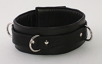 Ошейник средний. Ширина 5см. Застежка: ремешок с пряжкой. На ошейнике имеется 3 вертикальных D-кольца. Внутри мягкая проставка, обтянутая кожей. Подшитый. Диаметр от 8 до 13 см. Материал: натуральная кожа. Ошейник в BDSM может иметь различные назначения. Он может использоваться в качестве антуража для создания образа. Может использоваться в практическом назначении как один из связующих элементов бандажа. А самое главное - он имеет глубокое психологическое значение, так как ошейник это основная эмблема подчинения и наказания.