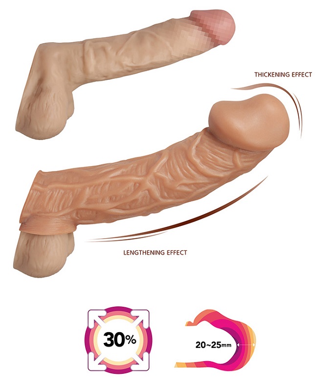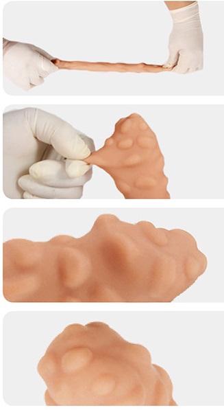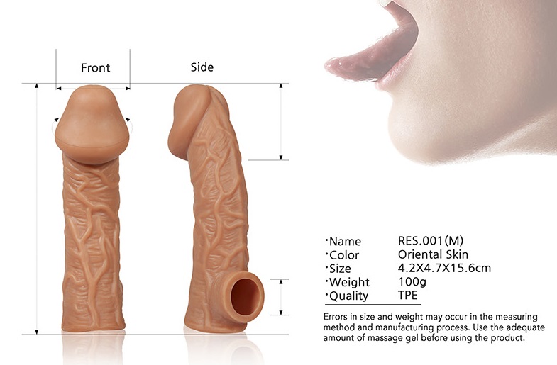 Насадка очень эластичная, имеет узор выпуклые венки по всей поверхности, для стимуляции эрогенных зон партнера, увеличивает толщину головки и ствола пениса. Специальное круглое отверстие у основания позволяет надежно фиксировать насадку на члене без лишних усилий.