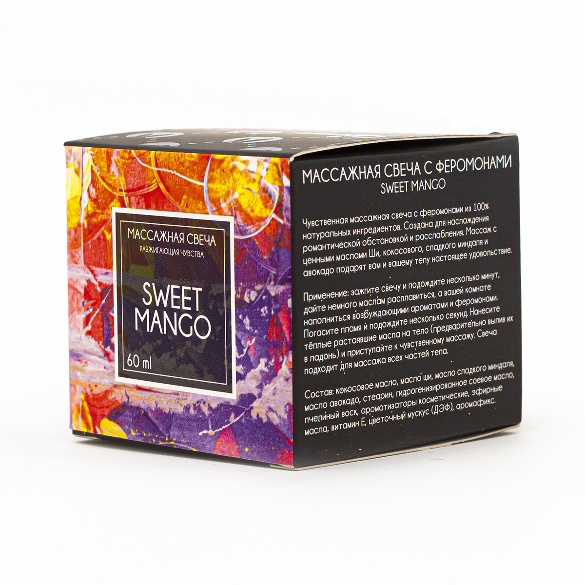 Чувственная массажная свеча с феромонами из 100% натуральных ингредиентов. Создана для наслаждения романтической обстановкой и расслабления. Массаж с ценными маслами Ши, кокосового, какао, сладкого миндаля и авокадо подарят вам и вашему телу настоящее удовольствие.